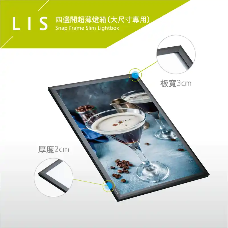 琦曜科技的四邊開超薄燈箱可依您的需求客製尺寸,更換燈片非常方便,四個邊框可輕鬆開合,讓您快速更新展示內容。產品可直放或橫放使用,LED燈低維護成本且壽命長,雷射打點導光板確保光線均勻分佈,呈現清晰明亮的視覺效果,吸引顧客的目光。超薄設計,厚度僅20mm,不占用寶貴空間,台灣製造,品質可靠,並享有一年保固。